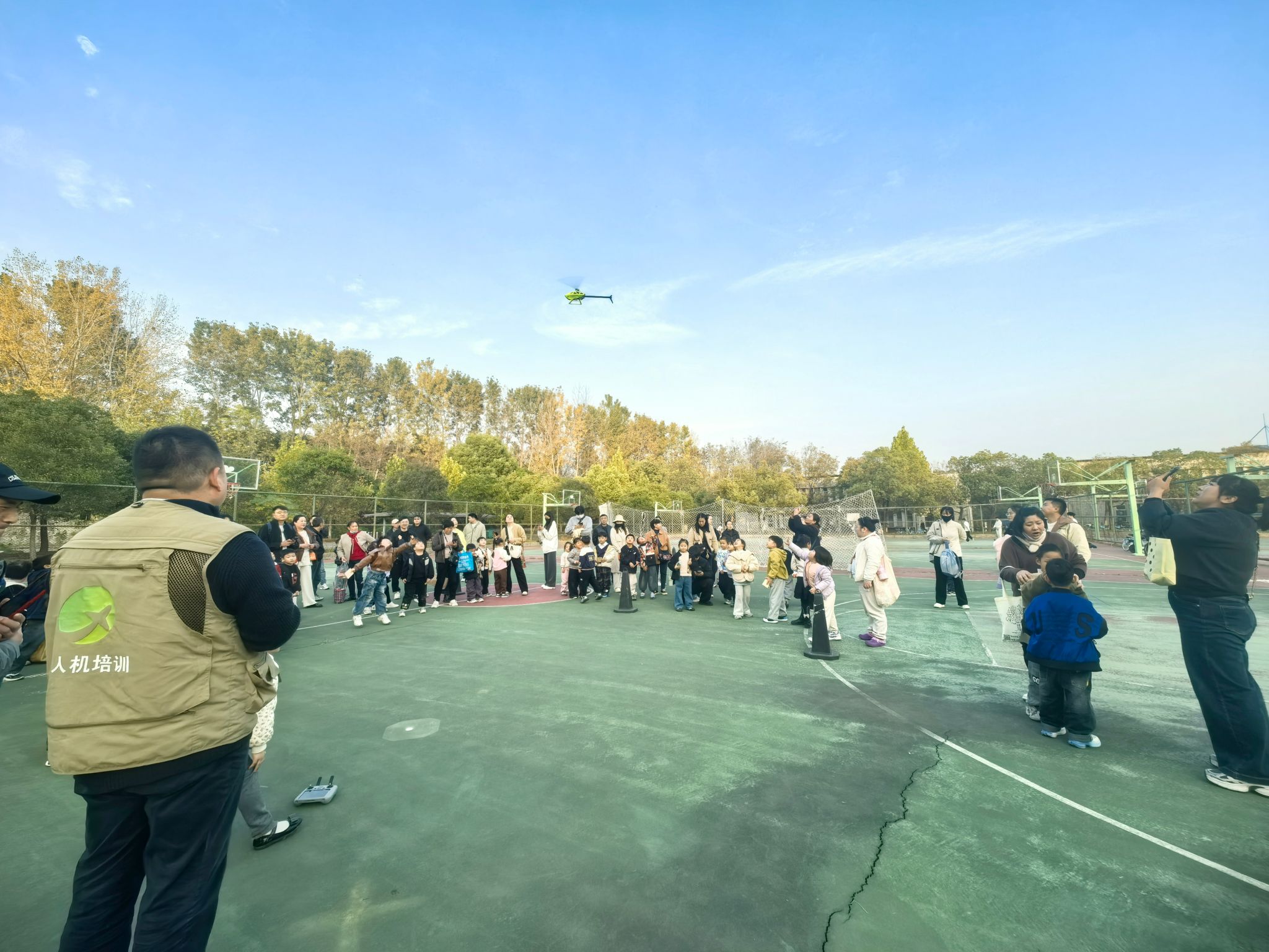 压轴大戏无人机表演在篮球场上演。两驾无人机腾空而起,在天空中变幻出各种炫酷的队形,引得全场掌声不断。孩子们挥舞着小手,追逐着空中的光影,梦想仿佛也随着无人机一同翱翔。